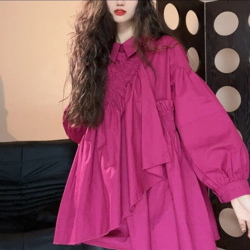 春の新型のデザイン感の純色の韓国版の長袖のシャツの女性はゆったりとしていて肉を遮って痩せています。