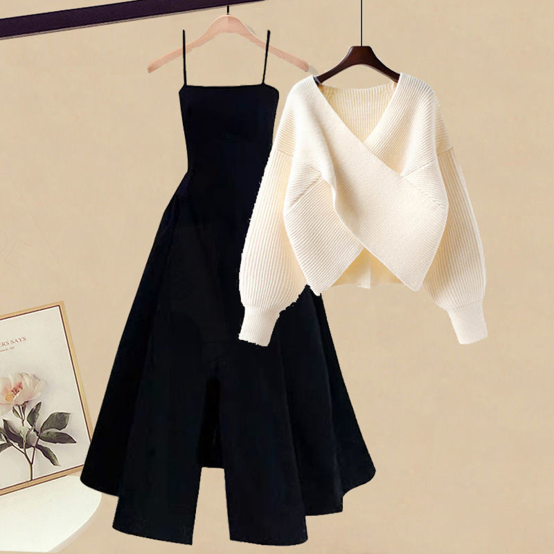 大きいサイズの女性の春のスーツの女性の2024年の新型のvネックの交差するニットのセーターのストラップのワンピースの2つのセット