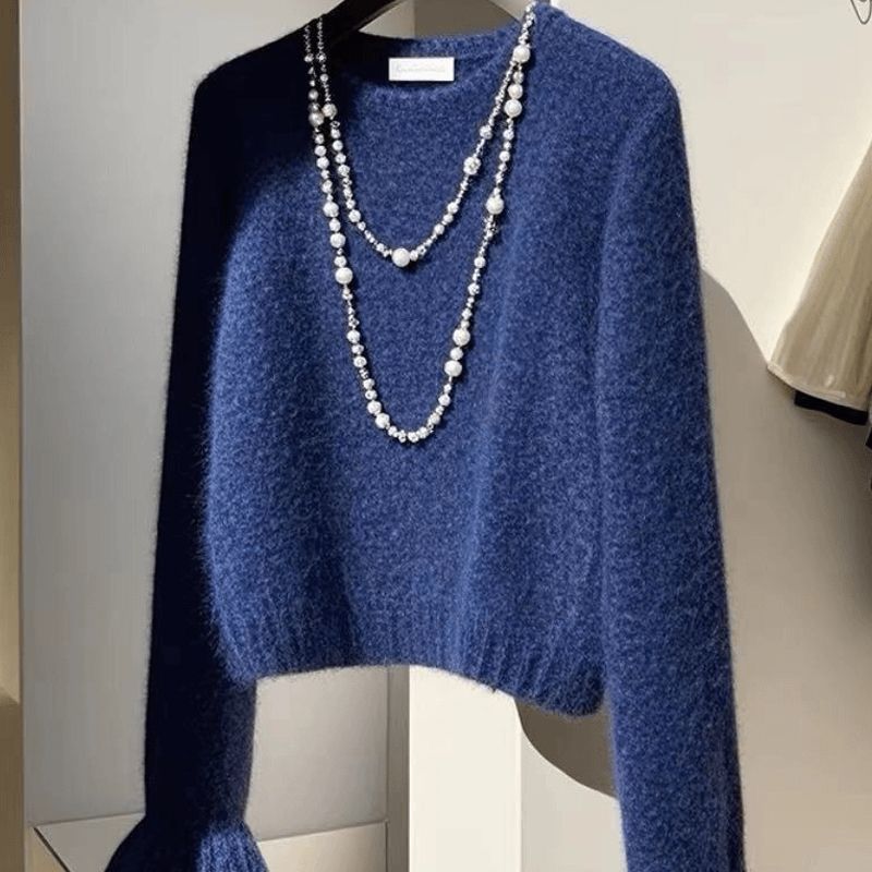 韓国版の怠惰な風の青いプルオーバーのニットの秋冬の洋風の減齢の新型はやせているラッパの袖のセーターの上着を現します。