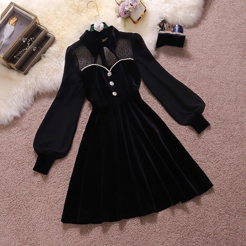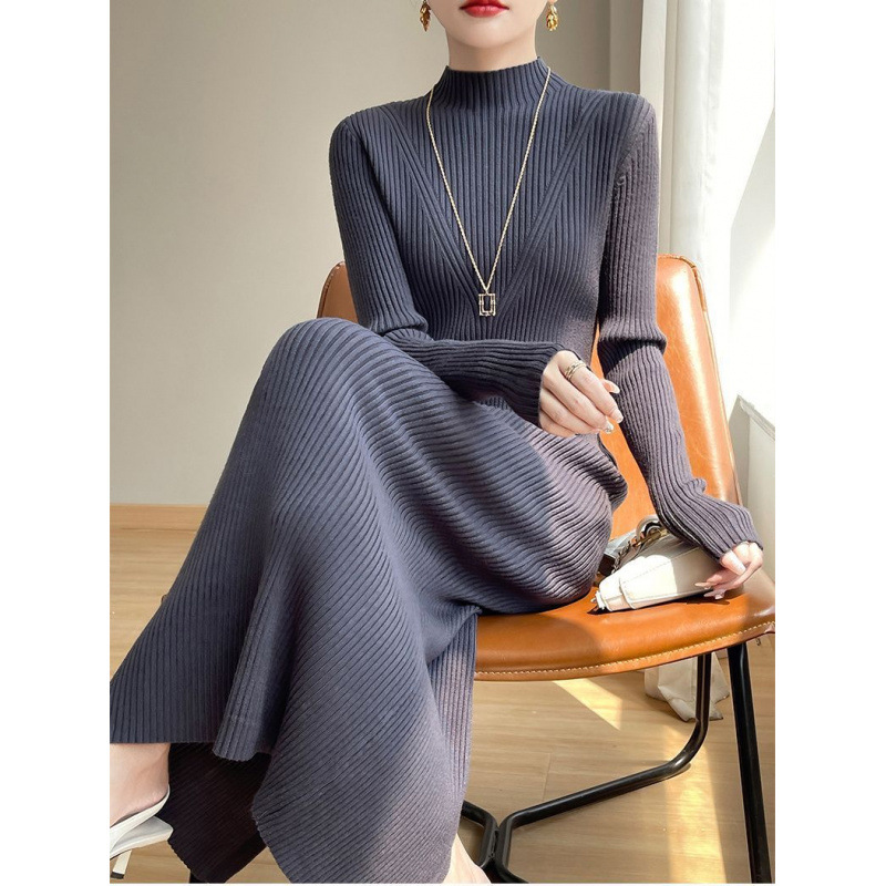 秋冬の新型のワンピースの女性の半高の襟の感じの百合は痩せています。
