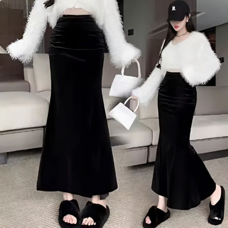 春と秋の金のベルベットの半身のスカートの女性の中の長いタイプの魚尾のスカートの2024秋冬の新型の黒色の高腰のA字はヒップのスカートを包みます