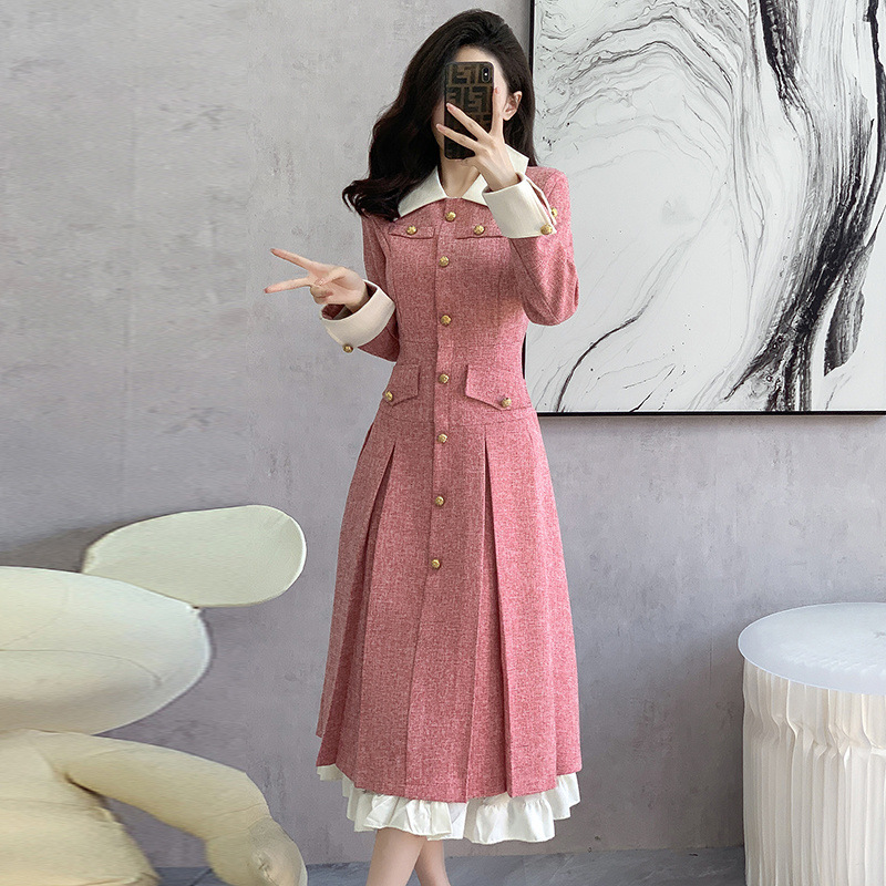 軽豪華感ピンクの小香が長袖のワンピースをつなぎ合わせます。