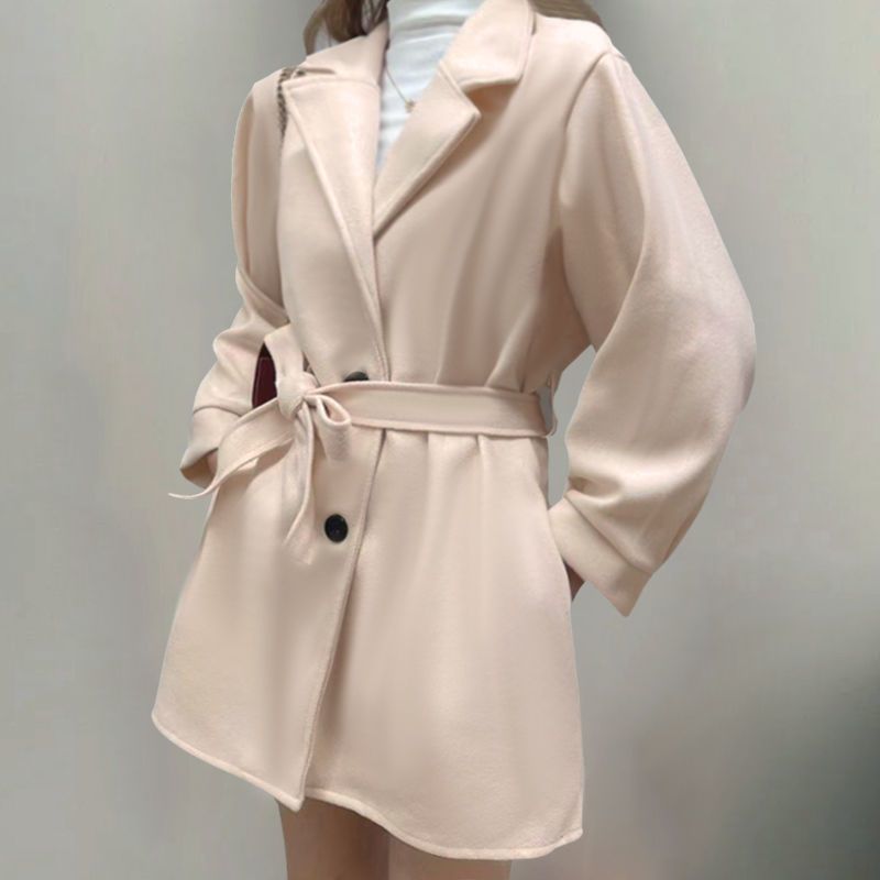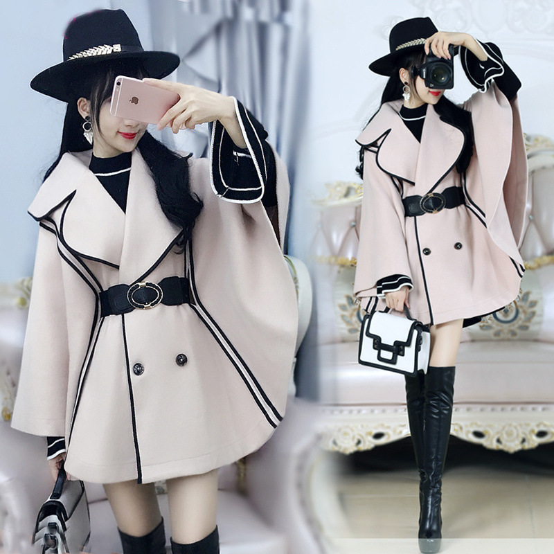 2024年秋冬女装ラシャコートベージュ色黒縁マント上着毛コート女性秋コウモリ袖