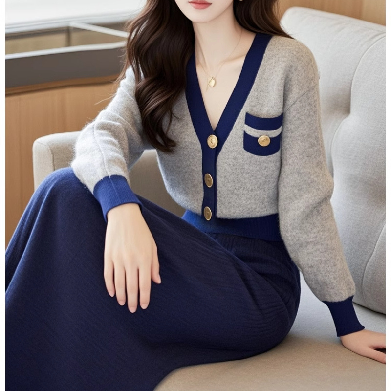 秋冬スタイルの小衆ファッションの小香風vネックの灰色のセーターの外に青い半身のスカートの軽い贅沢な通勤のスーツを掛けます。