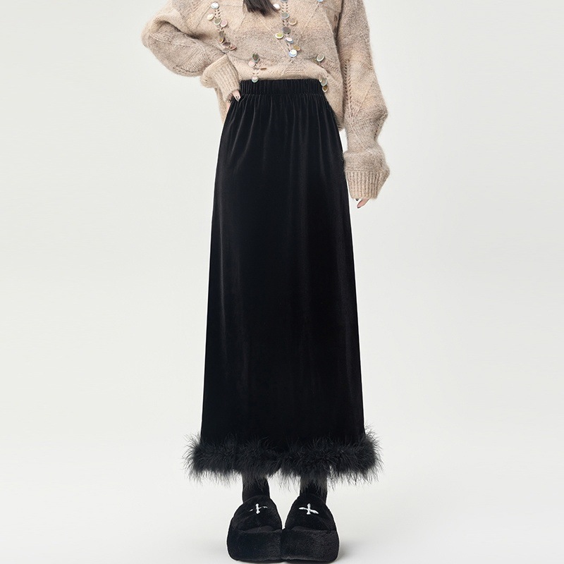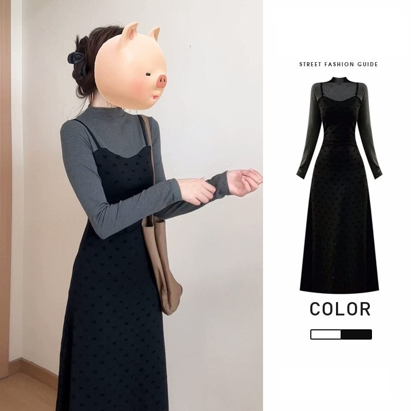 フランス茶休憩偽の2つの半高襟隠しワンピース2024深秋初冬の新型はやせた気質の長いスカートを見せます。