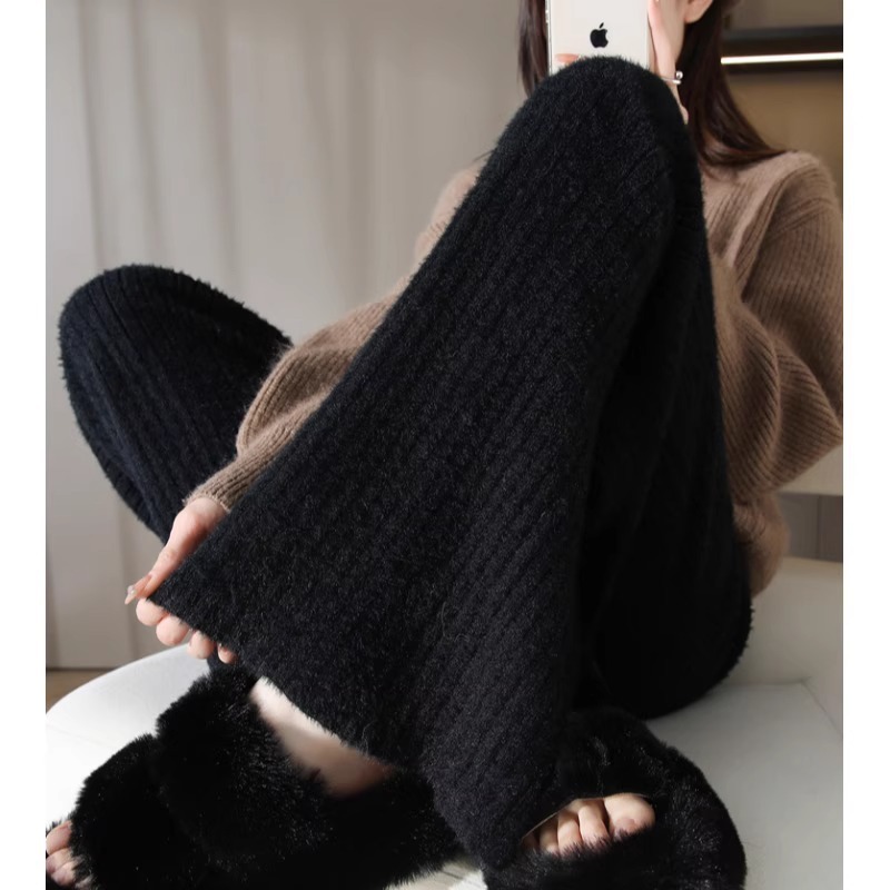 ミンクの毛のニットのワイドレギンスの女性の秋冬の新型のハイウエストの垂れ下がった感のカジュアルな緩い狭い版の厚いストレートのズボン