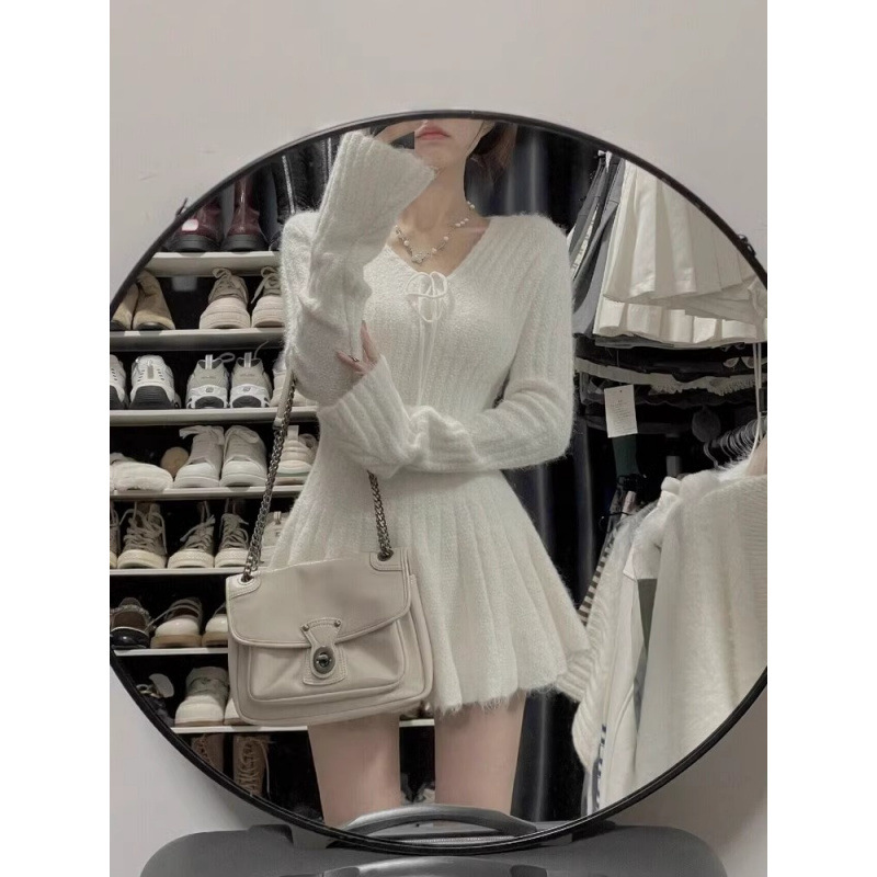 純欲バレエ風ニットワンピース女性秋冬腰気質デザイン感ケーキ蓬蓬蓬セーターショートスカート