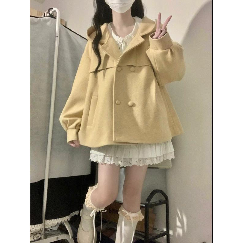 ミルクイエローの短い毛ですね。コートの女性は2024年秋冬の新型のかわいい小柄な長袖のポンポンのフードコートです。
