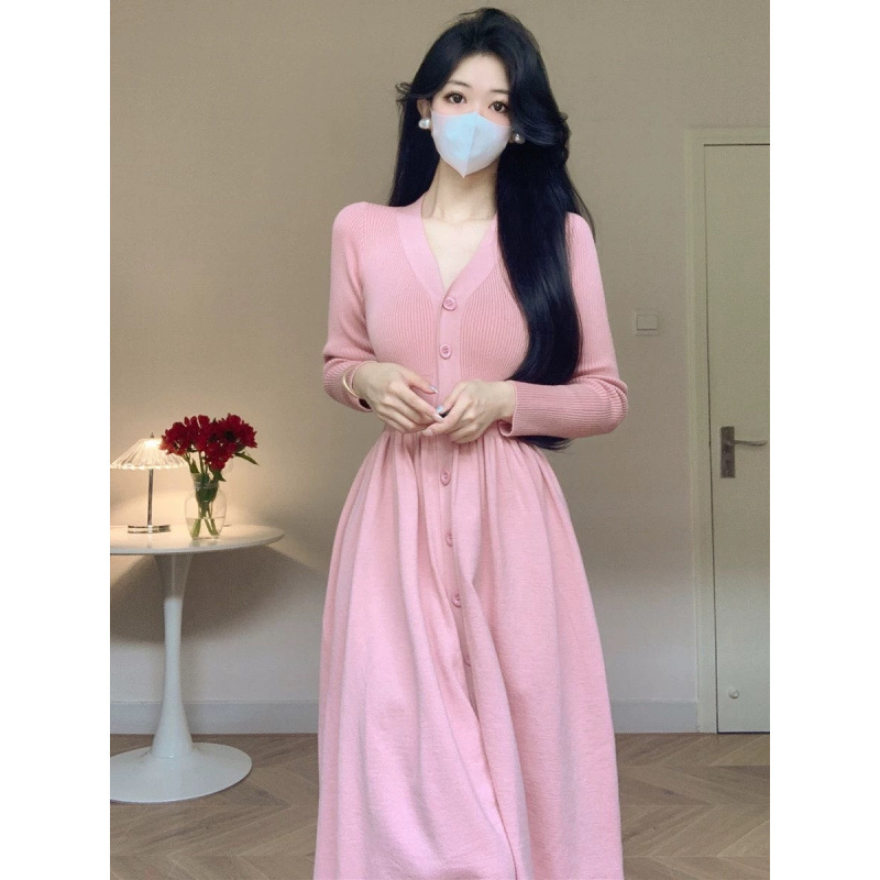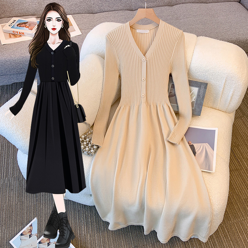 太った妹は腰の中の長いセーターのサスペンダーのスカートを収めてやせている大きいサイズの婦人服の秋冬の新型の膝のニットのワンピースを現します。