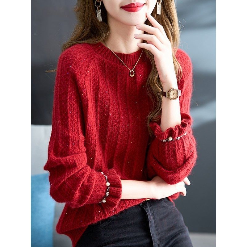 デザイン感のある新年の赤いセーターの底のシャツの女性の秋冬の新型の爆発的なフランス風のニット