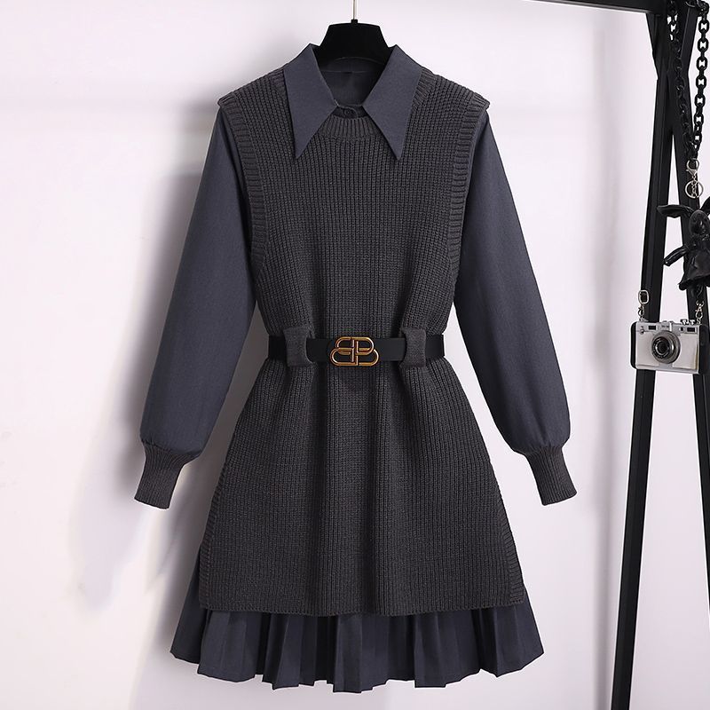 秋のスーツ女性2024の新しいサイズの女装ファッションは痩せ感があるニット馬甲ワンピース2点セット