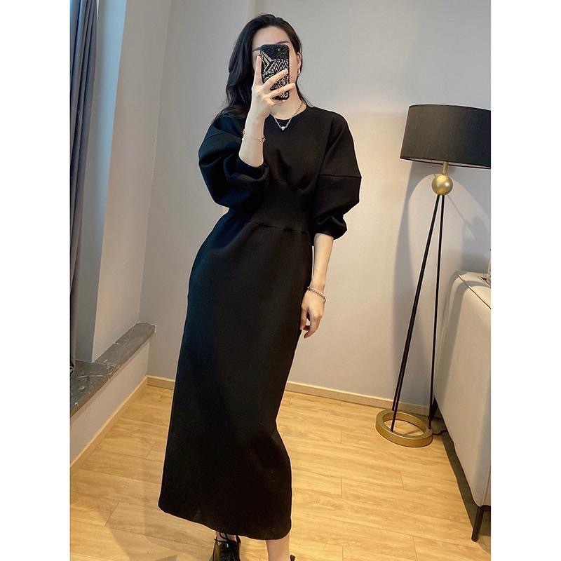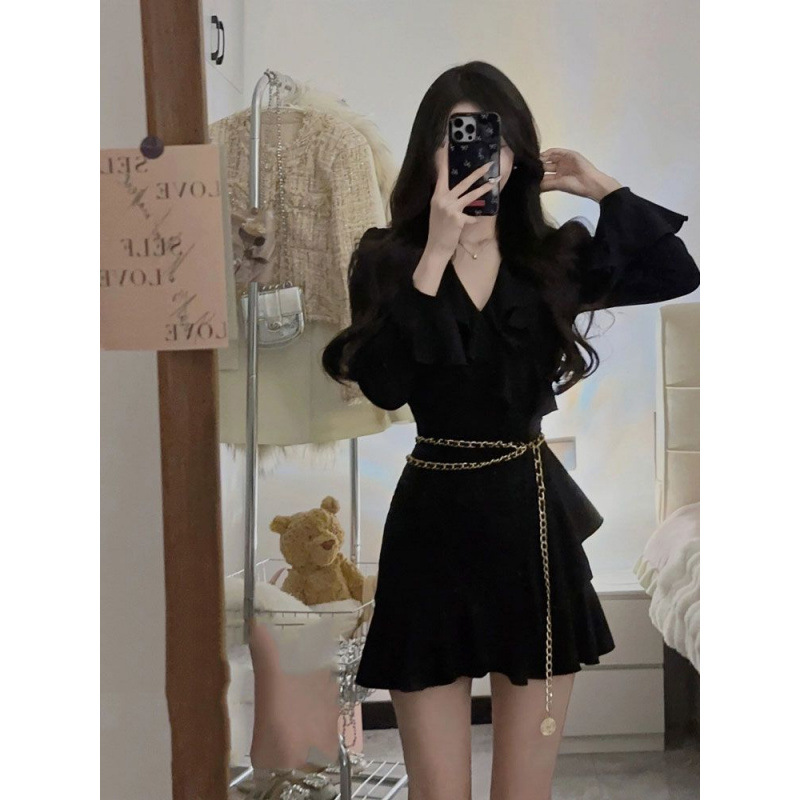 秋冬新作の小さい黒いスカートのハスの葉の縁のvネックのラッパの袖のギャルのワンピースの純欲な気質の修身はお尻のショートスカートを包みます。