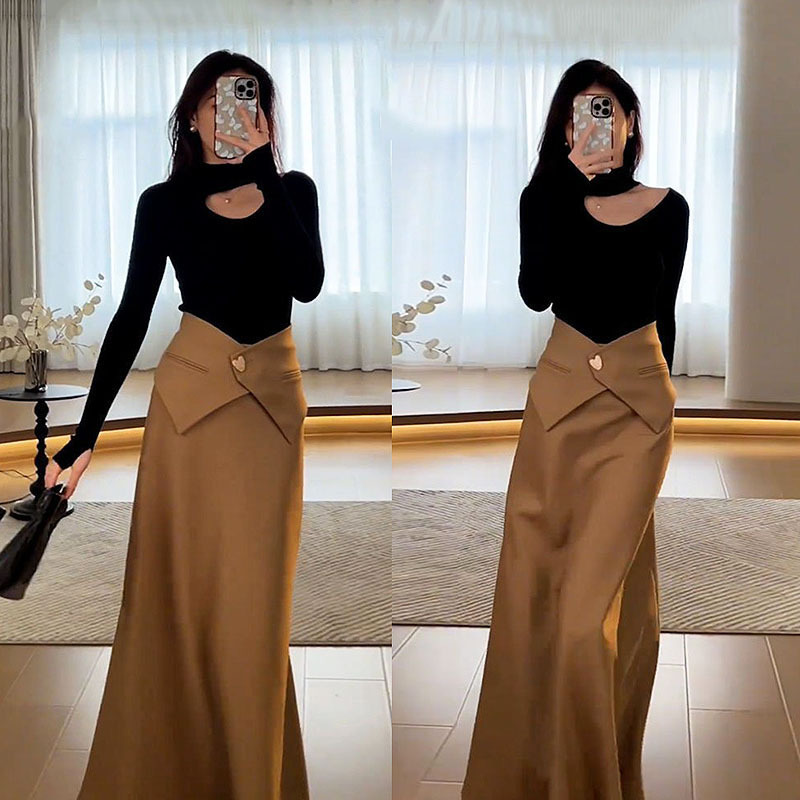秋冬セット2024新型香港風気質綺麗デザイン上着カーキハイウエストスカート2点セット潮