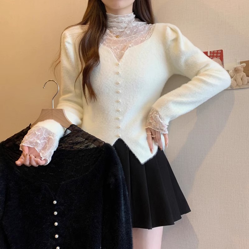 偽の2つのレースのつなぎ合わせは厚い半高襟のセーターの底のシャツの女性の秋冬の新型の洋風の中で短い上着を掛けます。