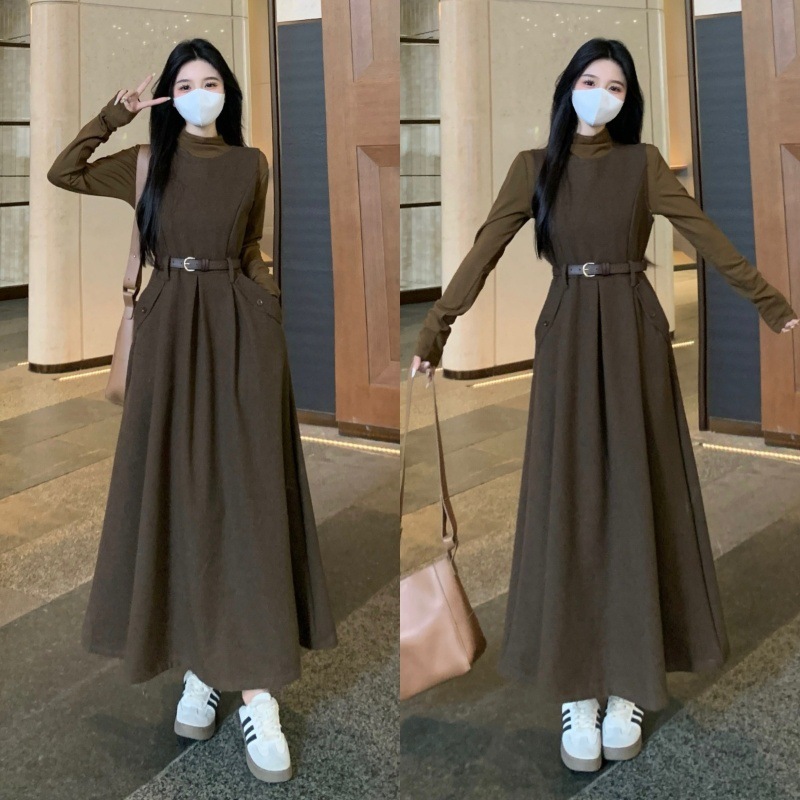 コートの半分の高襟のニットのワンピースの女性の秋冬の新型の感のストラップは腰の中で底の中のロングスカートを掛けます。
