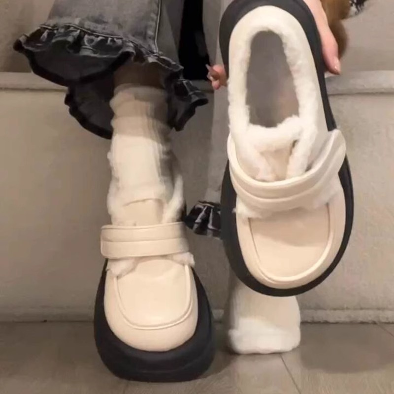 ベルベットの厚い底の小さい靴の子供は2024年の新しい秋冬の英倫風の大きい頭の浅い口の保温と厚い綿の靴をプラスします。