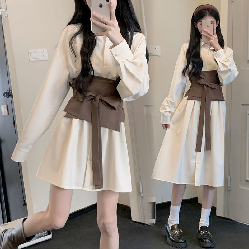 甘くて辛いシャツのスカートの女性の2024の新型の韓国版の優雅でゆったりしていて、やせて腰のA字の秋のワンピースの女子学生を収めます。