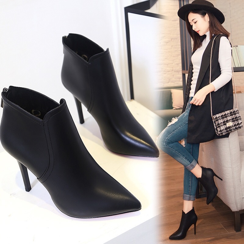 2024秋冬の新型の先のショートブーツの後でファスナーを合わせて女性の靴のハイヒールの細いかかとがやせているファッションの靴のマーティンの靴を現します。