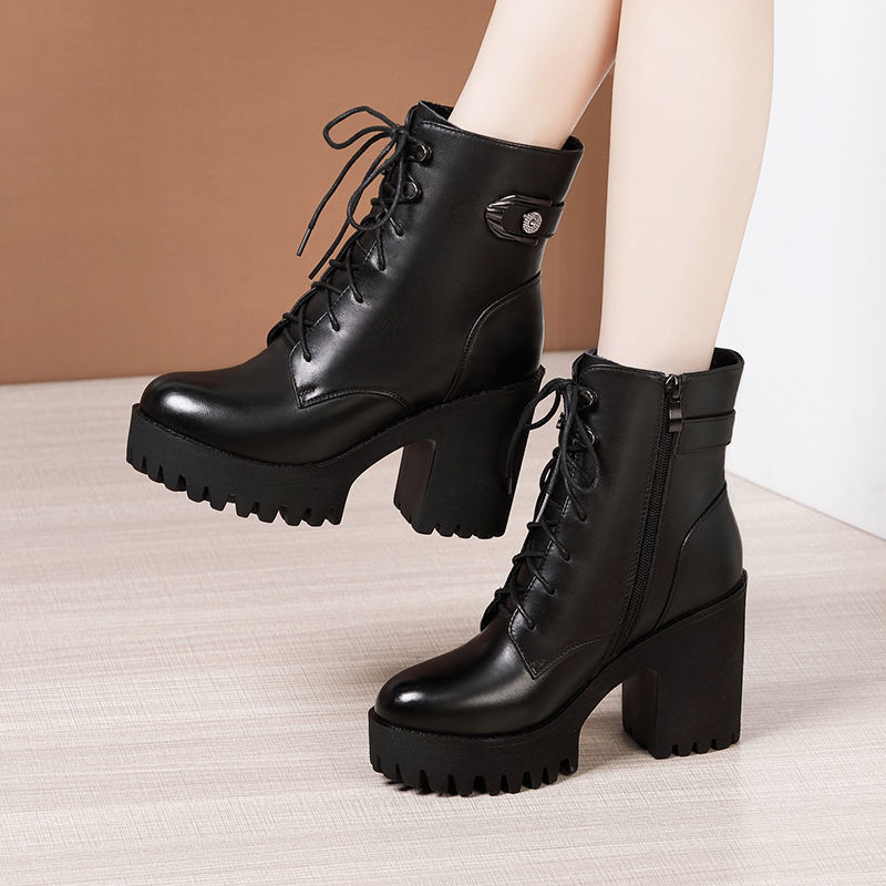 ハイヒールのマーティンブーツの女性2024秋冬の新型のベルベットのひもの丸い頭の中筒靴の防水台の厚い底のハイヒールのショートブーツ