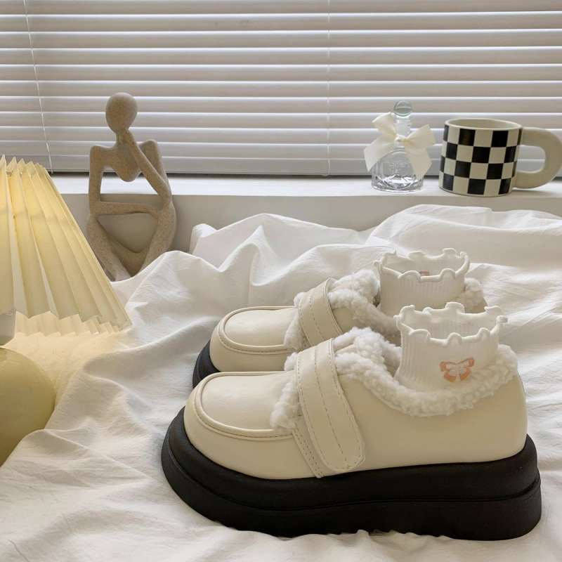 白いベルベットの厚い底の靴の女性2024の新しい秋冬のレトロな英倫風が高くなった頭の楽福綿靴