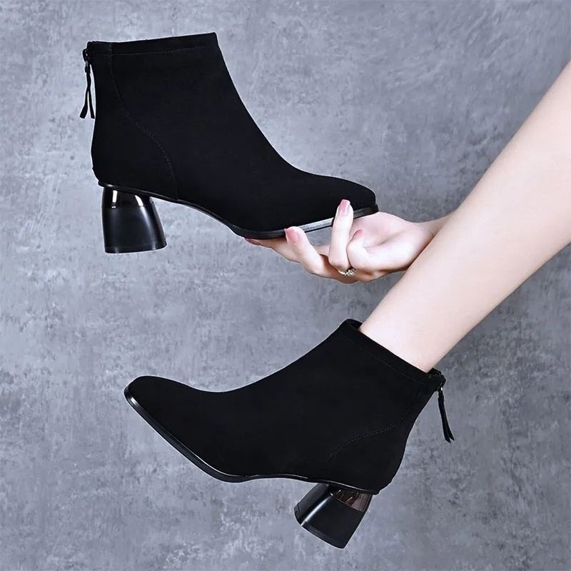 Z2024秋冬新作レディースシューズ ハイヒールブーツ 太ヒール レディースショートブーツ シングルブーツ ソフトレザー ポインテッドトゥ 裏起毛 マーティンブーツ レザー