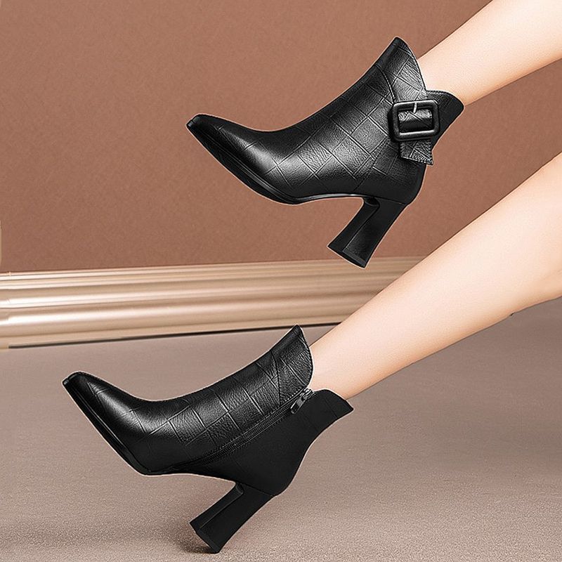 2024新型秋冬ハイヒールのショートブーツの女性の太さと柔らかい皮の小さい靴の先の馬丁の靴の裸の靴の秋冬の女性の靴