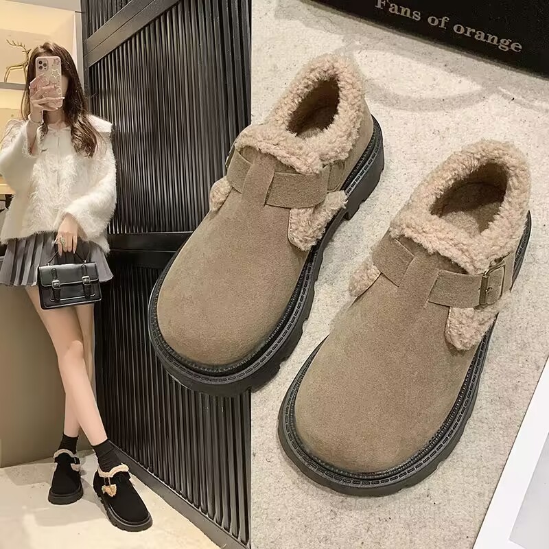 柔らかい底の毛羽立ちの靴の女性は2024の新しい秋冬のベルベットを履いて豆の靴を漕いで綿の瓢箪靴を履いている