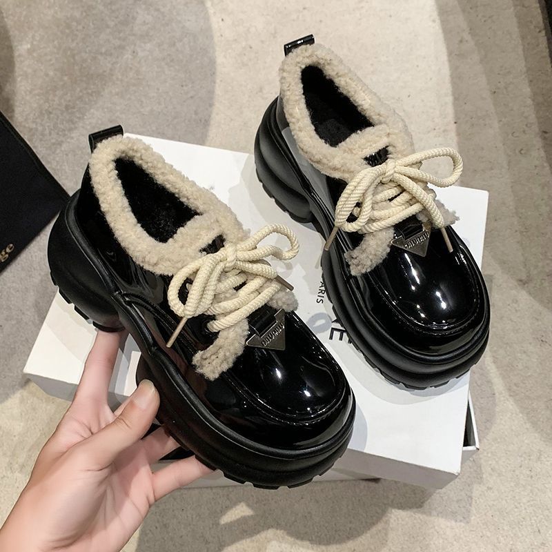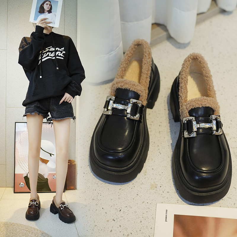 毛羽立ちの靴の女性2024秋冬の新型の韓国版の百合とベルベットの保温の厚い底のメアリー珍の靴のシングル靴jkカジュアルシューズ
