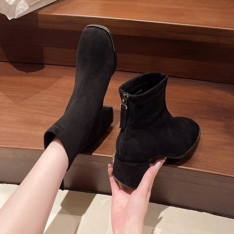 フランス風のスエードのハイヒールのショートブーツ秋冬2024の新型の太ヒールのベルベットの中の方の頭のやせている靴のマーティンの靴の女性の弾力性の靴