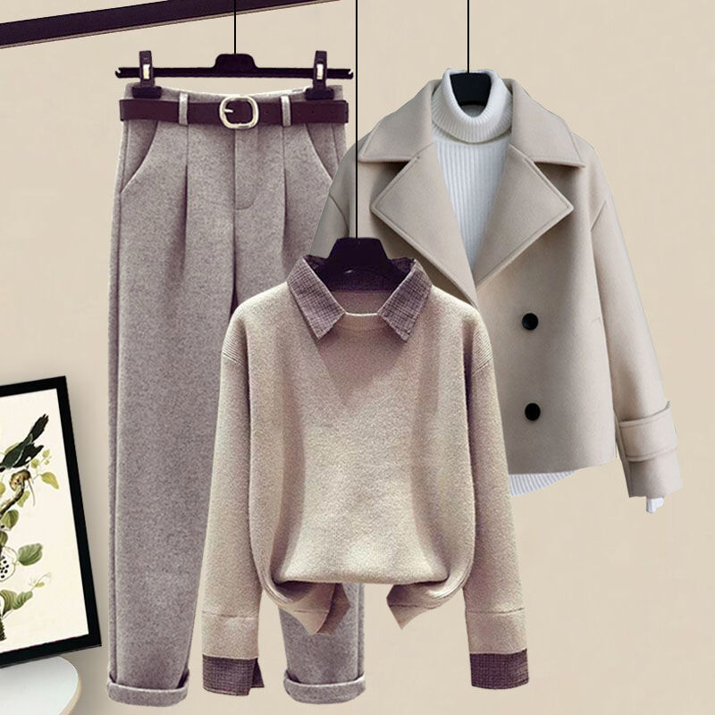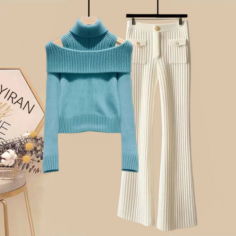 秋冬スーツ女性2024新型ファッション気質フランス風小香風露肩セーター百合カジュアルパンツ2点セット