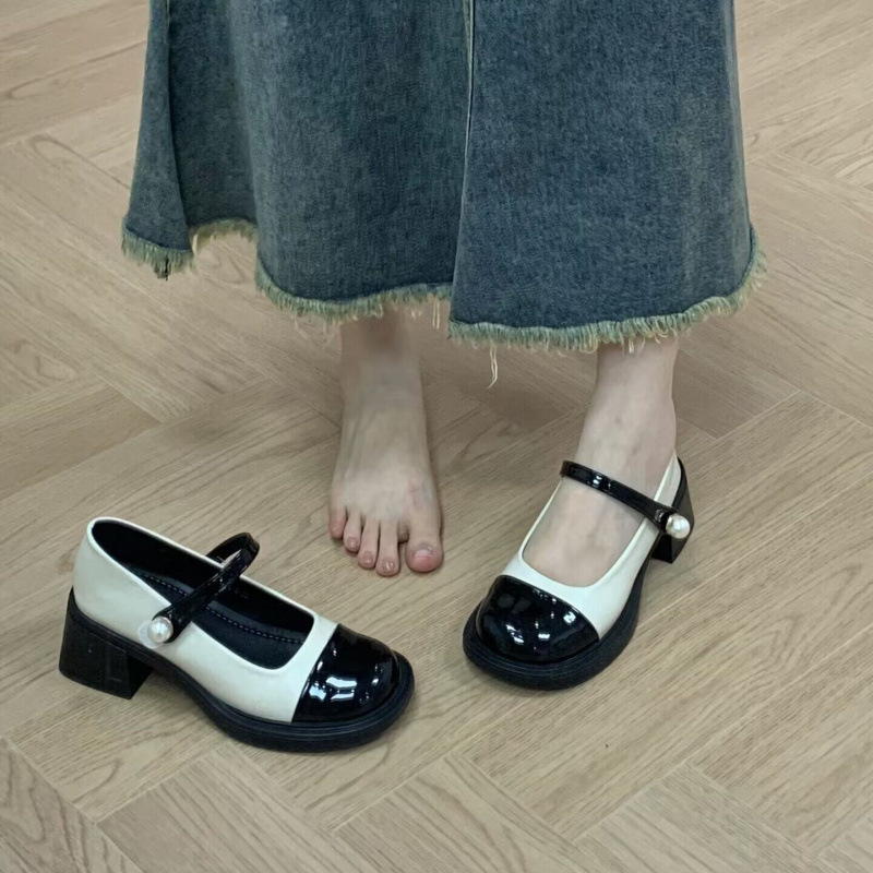 Z小香風ハイヒールメリージェーンレザーシューズ女性用2024年春新作ラウンドトゥワンストラップパール付き太ヒールシューズ