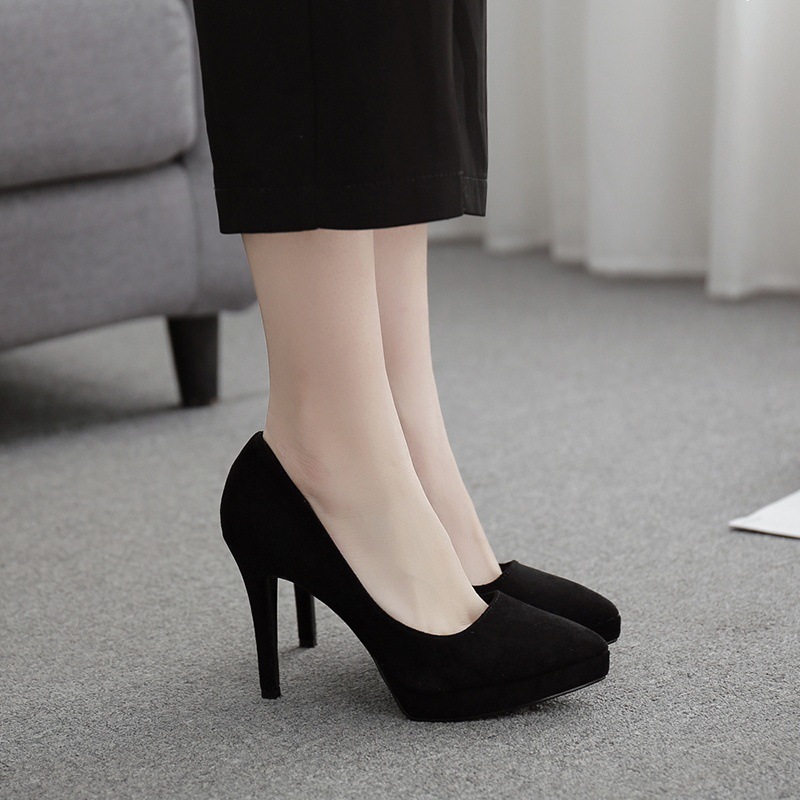 ハイヒールの女性の細いかかとの丸い頭の2024春の新型の防水台のスエードの黒色の百合の職業の靴の8cm、5cm