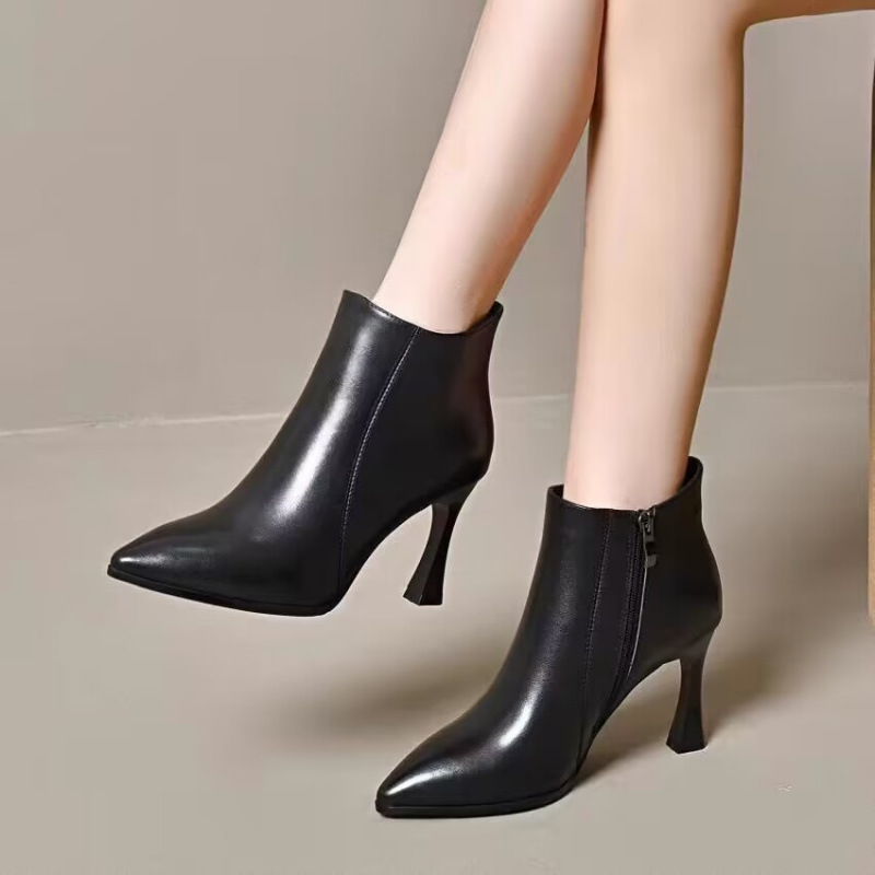 細いハイヒールの女性の柔らかい皮のショートブーツ2024冬の新型の先端のファッションとベルベットの靴に合わせて春と秋のブーツを合わせます。