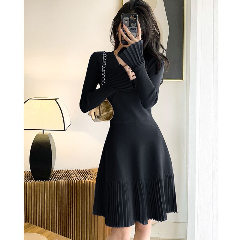 気質フランス秋冬新作ウエスト百シワ修身セーター長袖打底vネックニットワンピース中ロングスカート