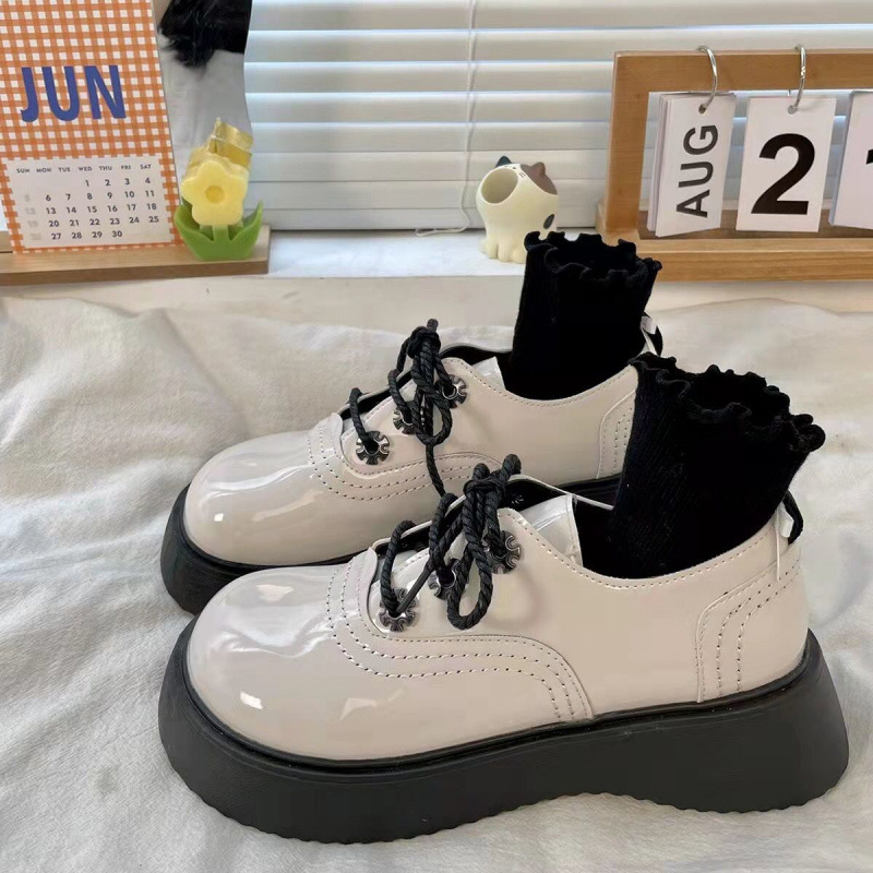 英倫風漆皮の厚い底の大きい頭の小さい靴の女性の2024秋冬の新型jkの大きい頭の黒色は厚い底の靴を結びます。