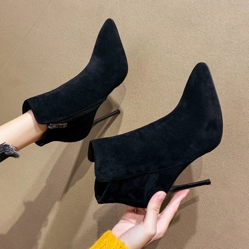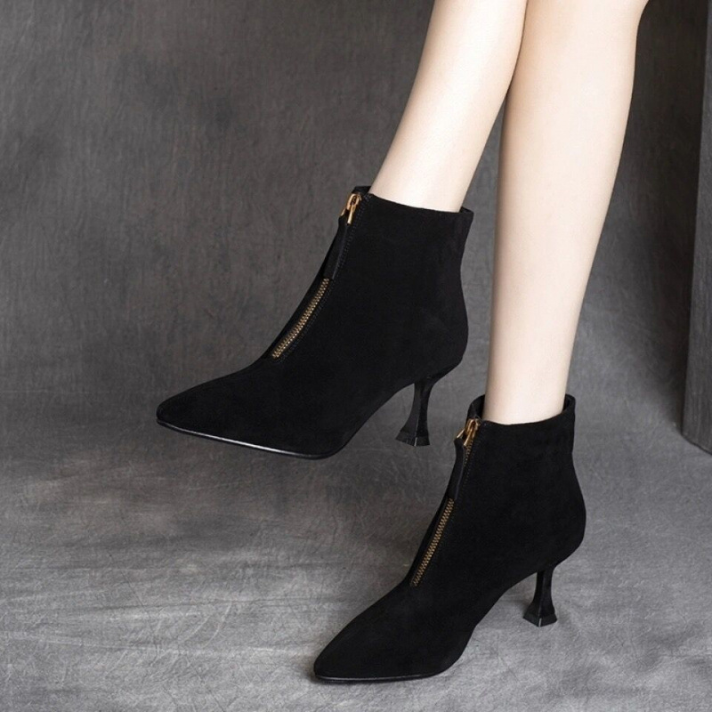 先の尖ったショートブーツの女性の細いヒールは2024冬のベルベットの小さいヒールのやせている靴の中でスエードの裸の靴のハイヒールのマーティンの靴と