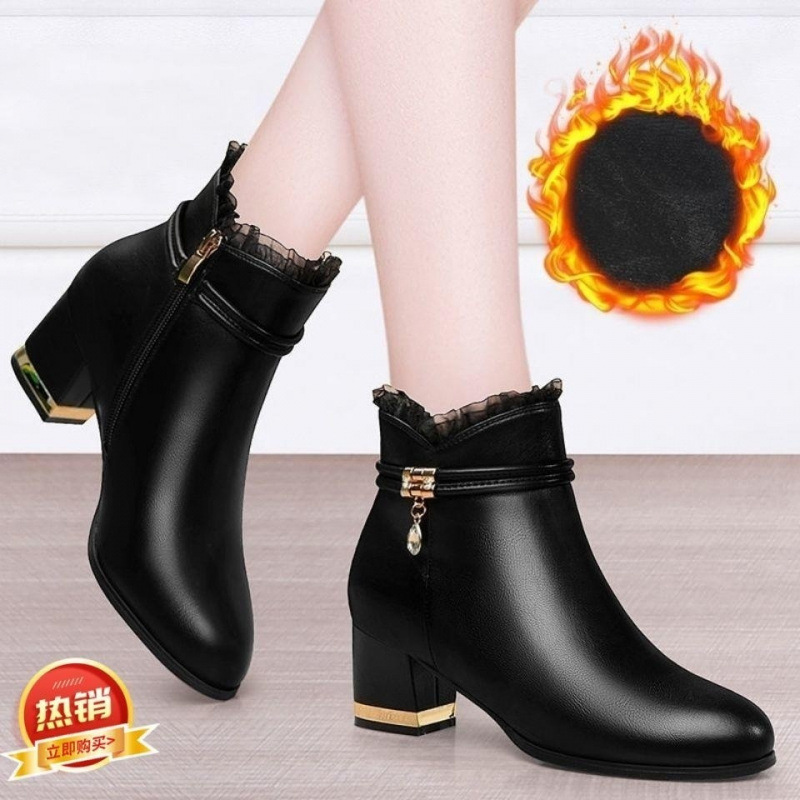 秋冬の女性のショートブーツの女性の太さと百合2024の新型のベルベットの女性の靴の高さのハイヒールのマーティンの靴の中で皮の靴と