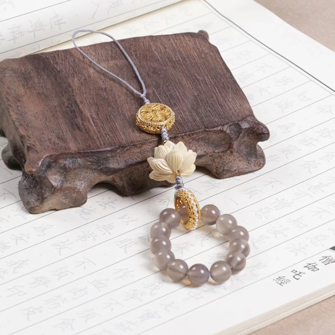 新商品の法喜文創灰瑪瑙黄財神手捻蓮車掛携帯電話のキーホルダーのペンダントは字を刻むことができます。