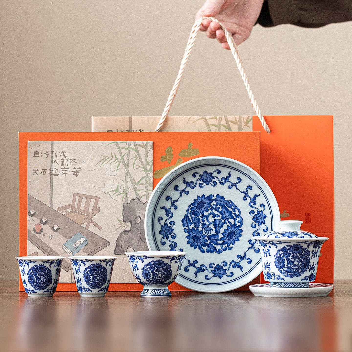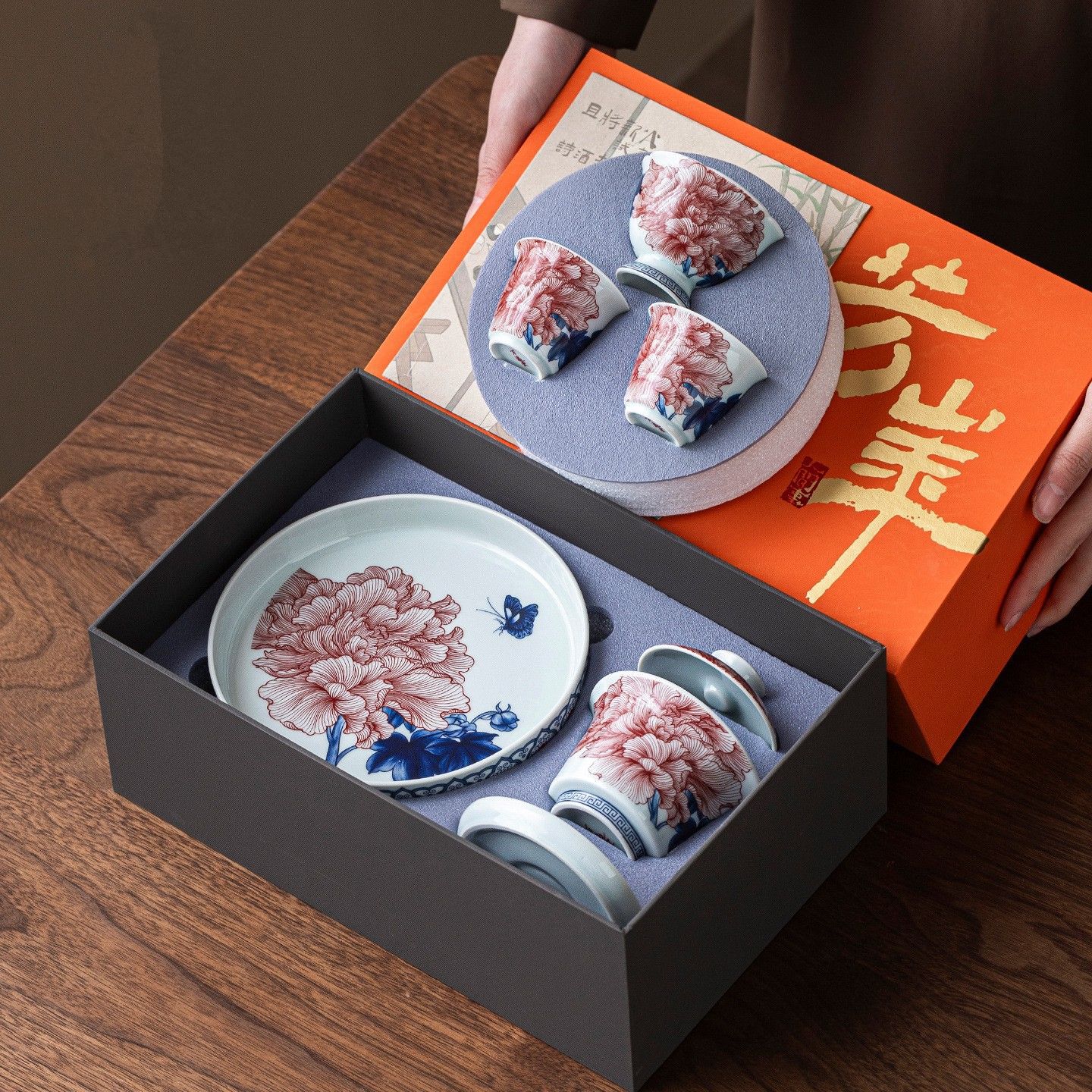 牡丹青と白の磁器カンフー茶セット 2025 新しいハイエンドの女性のホバー可能なティーボウルライト高級ギフトボックス
