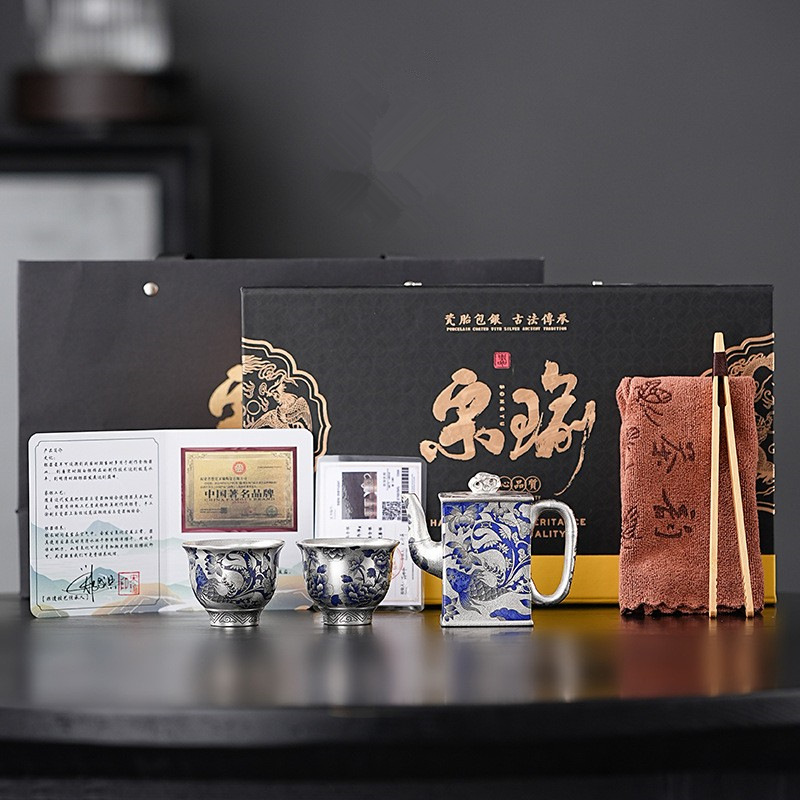 無形文化遺産紫禁城文化創造銀箔神鳥と飛魚カンフー茶セット、ポット 1 個とカップ 2 個、リーダーと長老へのお土産として