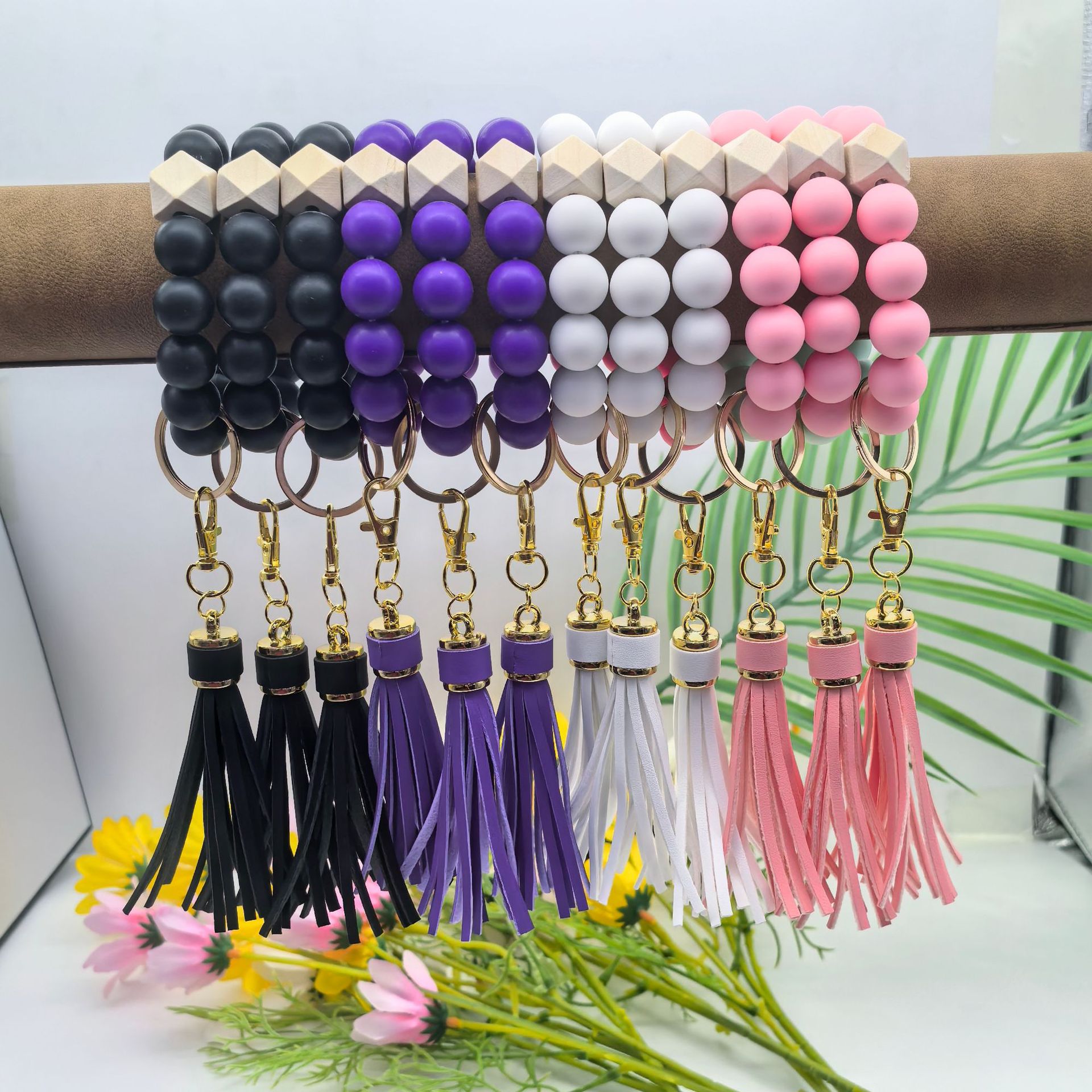 シリコンビーズブレスレット手首キーホルダーPU革フリンジビーズキーホルダー女性アクセサリー