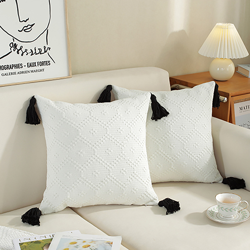 アマゾン北欧純色シンプル純綿編み幾何学ひし形格子流蘇腰枕快適クッションカバー抱き枕