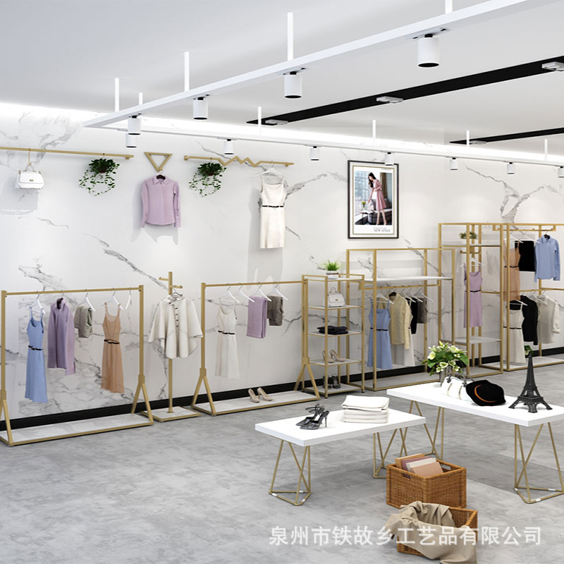 北欧風鉄芸服装店展示棚金色側掛けラック婦人服店棚床置き式掛け服ラック