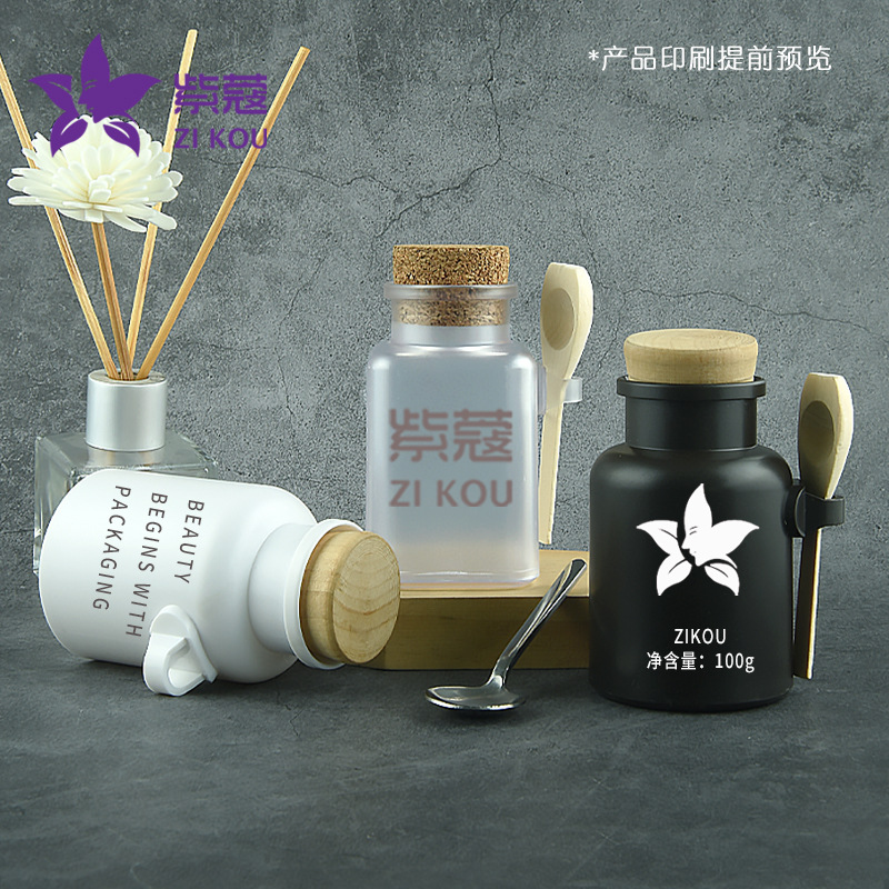 100ml-500グラムabs丸型フロスト足浴塩瓶ペットボトル軟硬実木蓋木スプーンマスク泥粉