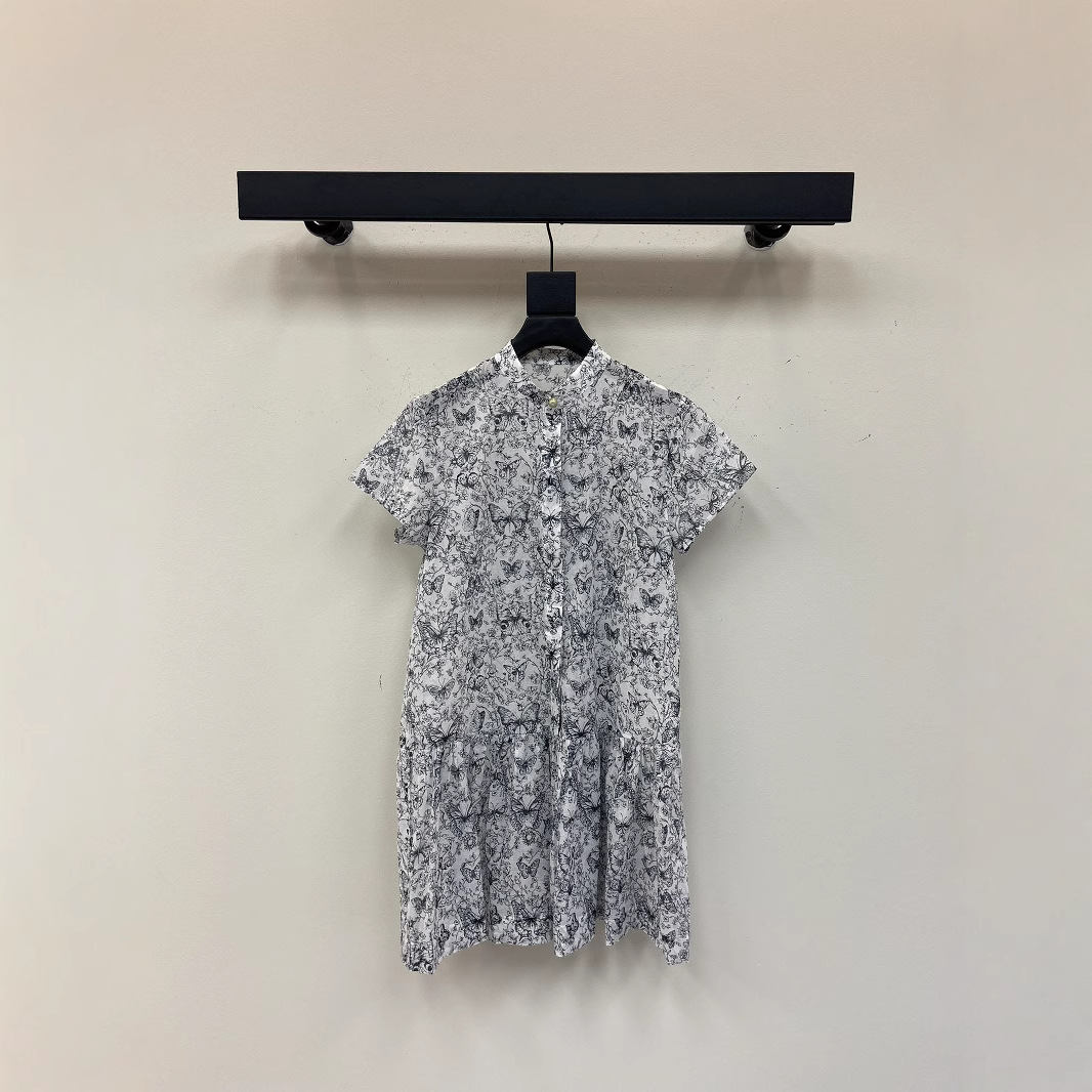 Spot D's 2025 高精細新蝶花柄スタンドカラーパールボタンノースリーブショートスタンドカラードレス