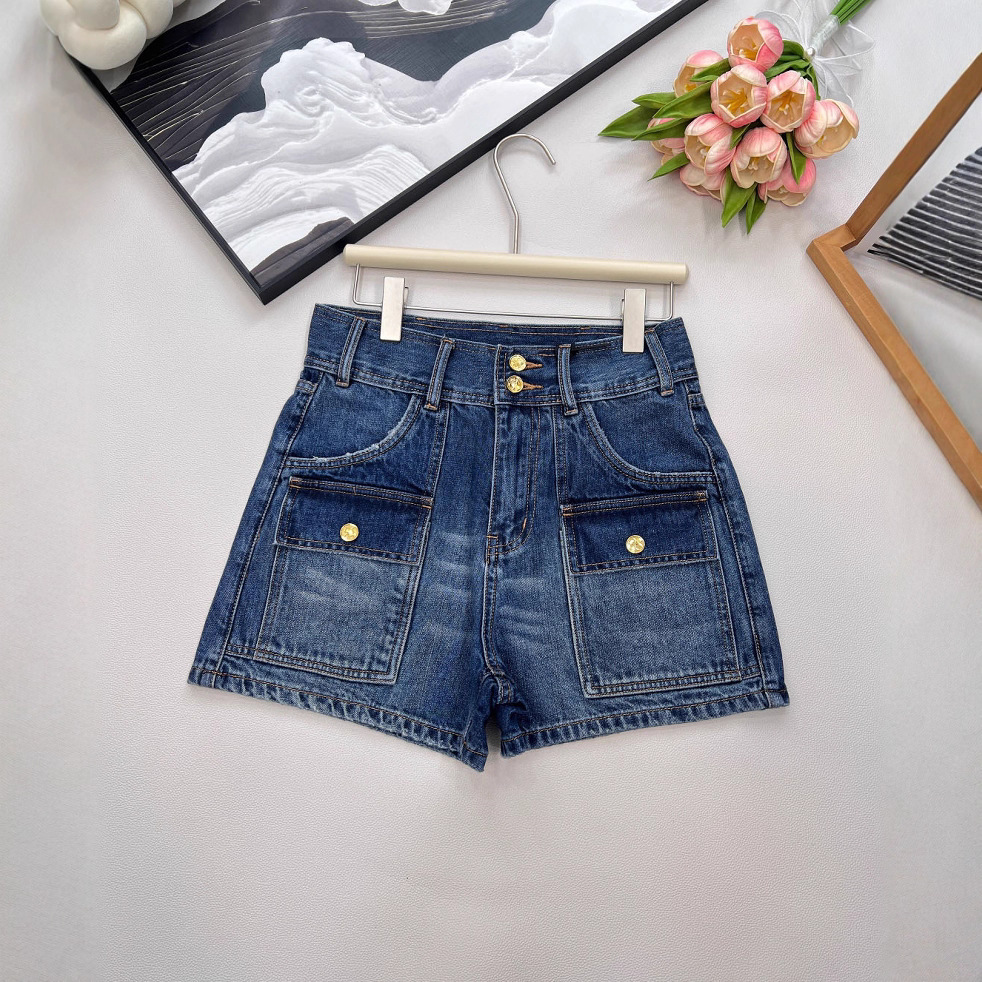Spot ce home 2025 夏ハイエンドメタルバックルダブルポケットデニムショートパンツレディースハイウエストスリムストレートホットパンツ