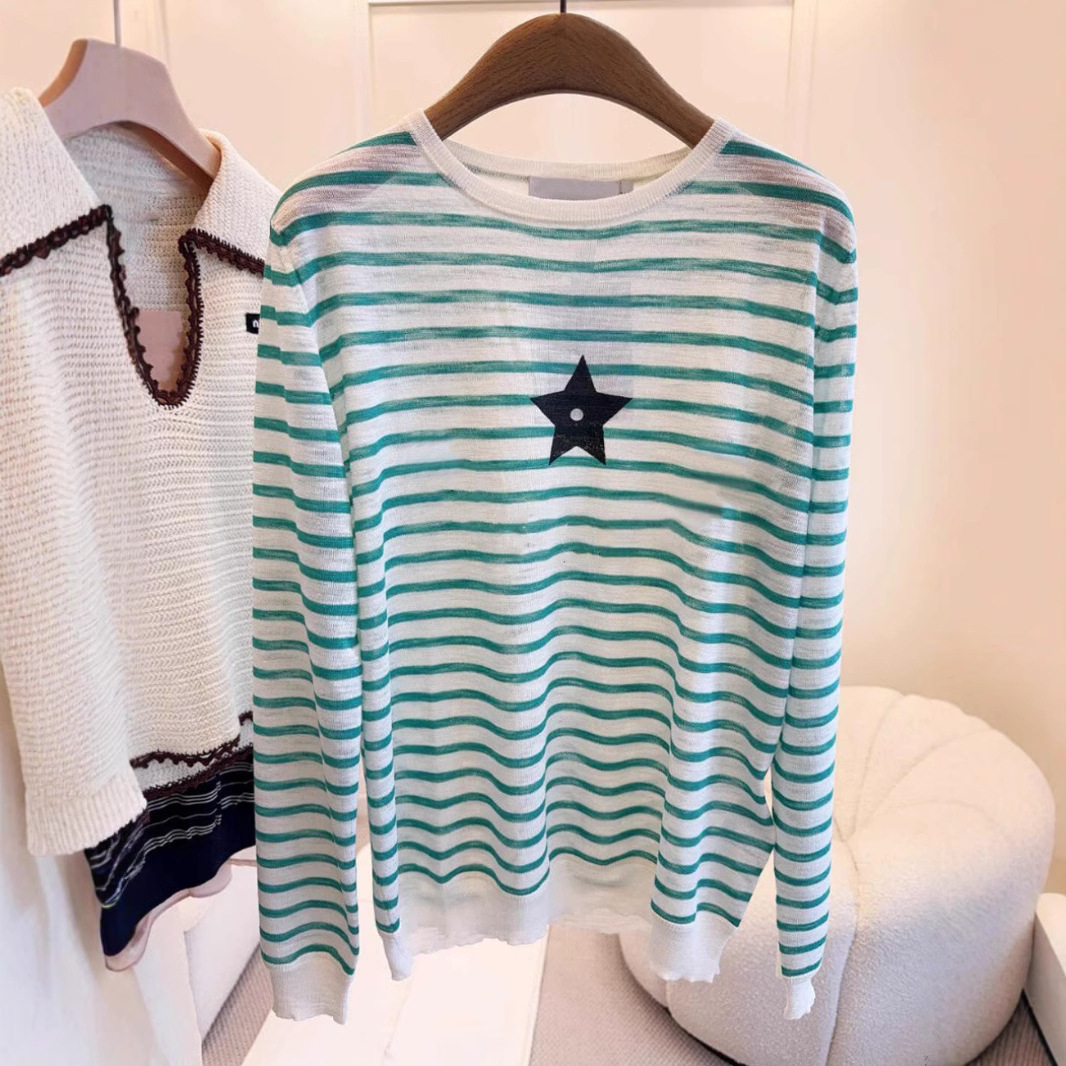 在庫ありD家2025新作ゆったりストライプ五芒星文字プリント麻混カシミヤ長袖ニットセーター女性用