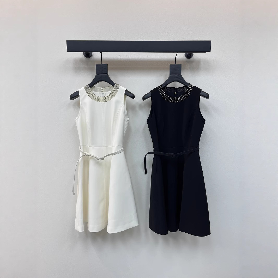 2025D ヘビービーズカラーシルクウールウエスト痩身ソリッドカラーラウンドネックリトルブラックドレスノースリーブドレス女性用