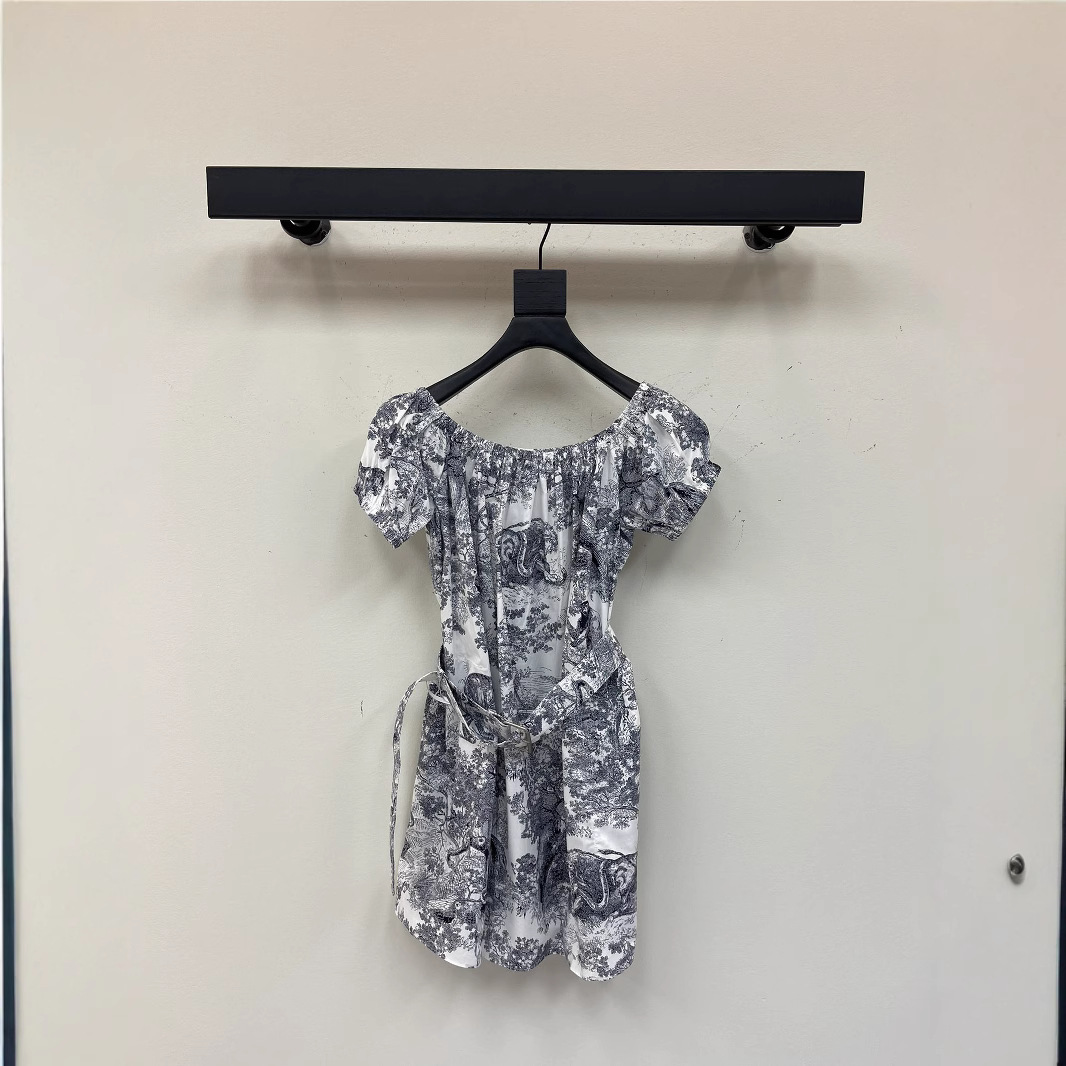 2025D ホームアニマルジャングルワンショルダーパフスリーブウエスト半袖プリントドレスホリデースタイルハイエンドレトロ