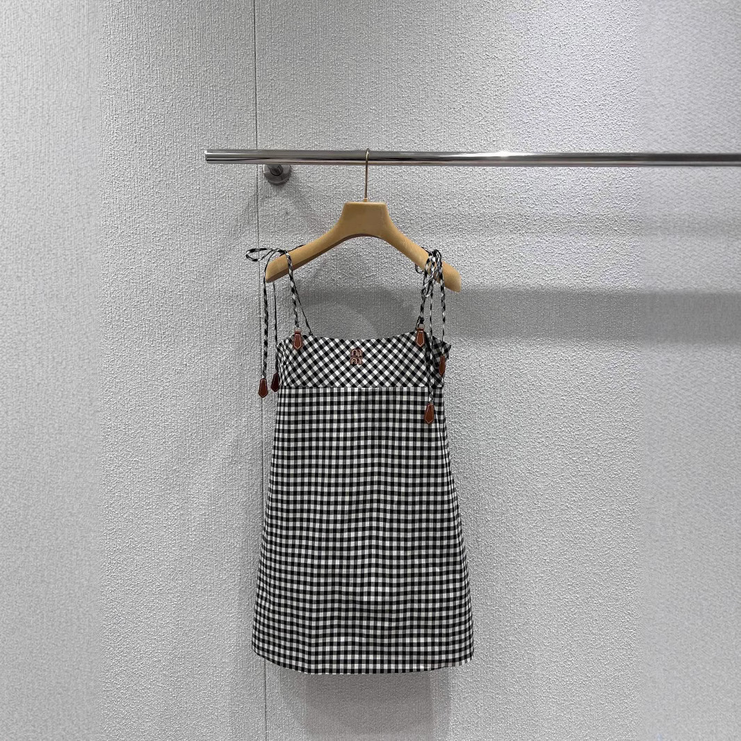 在庫あり miu 2025 夏新作カレッジスタイル黒と白の小さなチェック柄レターレザーラベルレトロサスペンダードレス